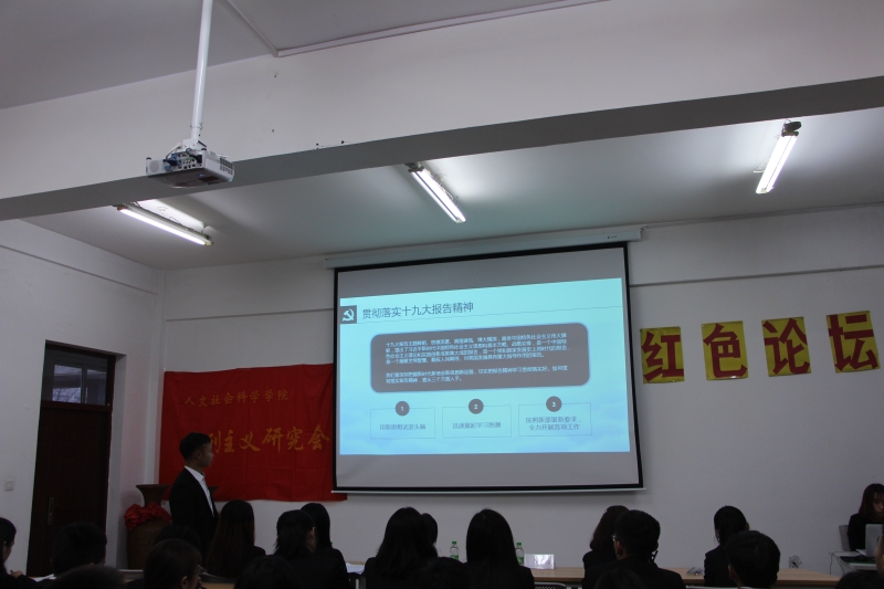 11月7日下午,美高梅“第四届红色论坛----十九大学习专题”在文理馆102举行。本科生党支部党员、马列协会会员、2017年下半年发展对象、积极分子代表参加学校交流。本期红色论文主要围绕十九大精神,三个党支部选派三名党员分别就《十九大报告学习分享》、《学习井冈山精神 争做合格共产党员》、《“一带一路”国际合作高峰论坛》进行交流。通过交流,与会师生了解了十九大报告里的新提法、新思想、井冈山精神的由来、“一带一路”的内涵和“一带一路”国际合作高峰论坛的意义。大家围绕十九大精神进行了现场交流,同学们结合关注的特点话题、高校教育话题、主要矛盾变化等分享了学习感受。党员们纷纷表示,党的十九大吹响了夺取新时代中国特色社会主义伟大胜利的前进号角,作为大学生党员务必要紧跟党的脚步,加强理论知识和科学文化知识的学习,在学习、生活和工作中起到模范带头作用,为学校建设教学研究型贡献力量。