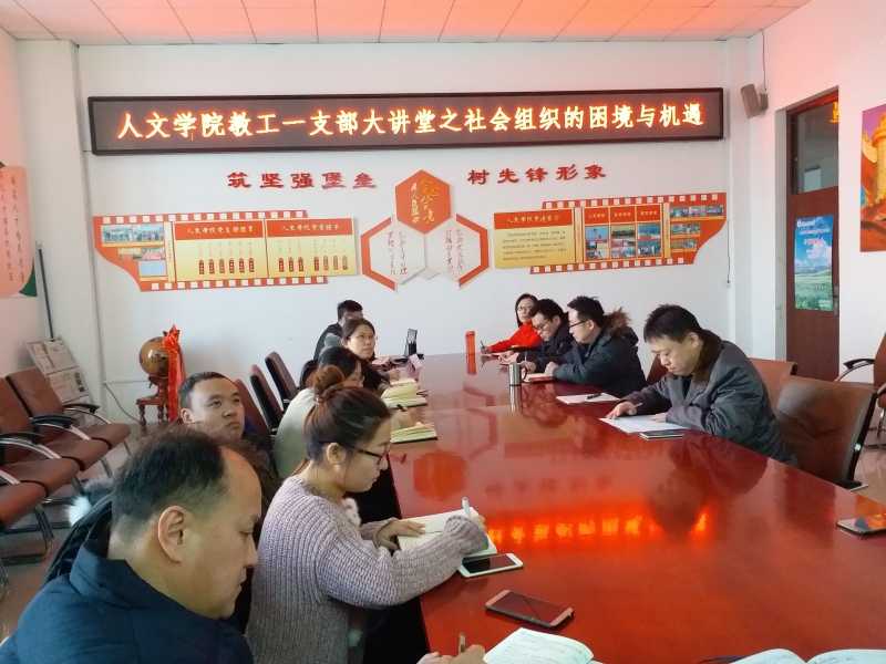 12月12日下午3点30分,美高梅教工一支部举行第四期教工大讲堂进行中。会议由支部书记刘秀岩主持,本期大讲堂邀请社工系主任胡晓兵教授结合十九大报告精神,做题为《社工组织的发展困境与机遇》报告。